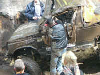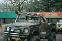 fall down against the bikinitop ( full of mud ). After which is was time to look at the damage and see how we could get it back on it's wheels again It was decided to put a rope from the winch on the car on top of the sandy wall to the front of the chassis and one rope to the winch of the LWB behind me and get it back up that way Worked perfectly and within minutes it was on it's 33"s and I could pick up all the lost parts from the deep mudpuddle and throw them back into the car ....and be winched out of the mudhole ( I didn't want to start the engine untill I was sure it was oké ) to the parkinglot...... ..where Dave ( of Suzi's Place ) pulled the plugs and checked the oil ( both no problem, just a little oil on the inside of the hood from the engine-vent ). The interior was covered in mud up to the top of the dash, ventholes, radio everything Left door was crashed beyond repair, windowframe and rollbar too, right door was all wrapped up because of the rollbar and windowframe pushing upon it. A big dent in the left rearpanel too. Here you can see the mud and damage to the body, when I'm driving to the other parkinglot...... .....where - again - some guys from Suzi's Place did some bodywork on the Zuk, with professional equipment ( a ramp from the trailer, big hammers and a winch )..... ....So we could go back into the mud : Remon ( of - of course Suzi's Place ) called the owner of SP and told him what had happened and after they had all stopped laughing I was told they still had a good body for sale of off which Dave ( of........indeed ) wanted the frontclip anyway, so we bought it over the phone, I called my boss to ask a day off on Monday ( no problem there ). When we were all done riding we screwed a frontwindow frame off a Zuk that had to go on the trailer, bolted it on mine and Cora and I drove home, very windy but luckily no rain. The donorcar: it had just been apart for a repaint, so all the bolts came out easy ( like mine, which also had just been apart for a repaint ). It was Hamerite Black too, so hardly any diference with mine. I started at 9.00 working on my Zuk after hosing it down with the waterjet ( inside and out ) Some very minor hammering/welding had to be done to the tops of the rearpanels just underneath the rollbar where it had pressed hard on these panels causing both nuts to be torn loose. I had help from Nico, who actually only came in for some parts and coffee ( thanks Nico ;-) ) and besides being a busdriver he knows a bit or two about panelwork too, so out came the press and hammers. I must admit that Nico wanted to go on untill it was perfect but I saw no use in that, knowing I will probably bang into a tree or something next time I go OffRoad. I was proud to show everybody these pics, within 24 hours of the flip it was back home, with only minor work to be done ( like cleaning the chairs and interior and put back in all the Diamond Plate interiorpanels ) I like the doors black as